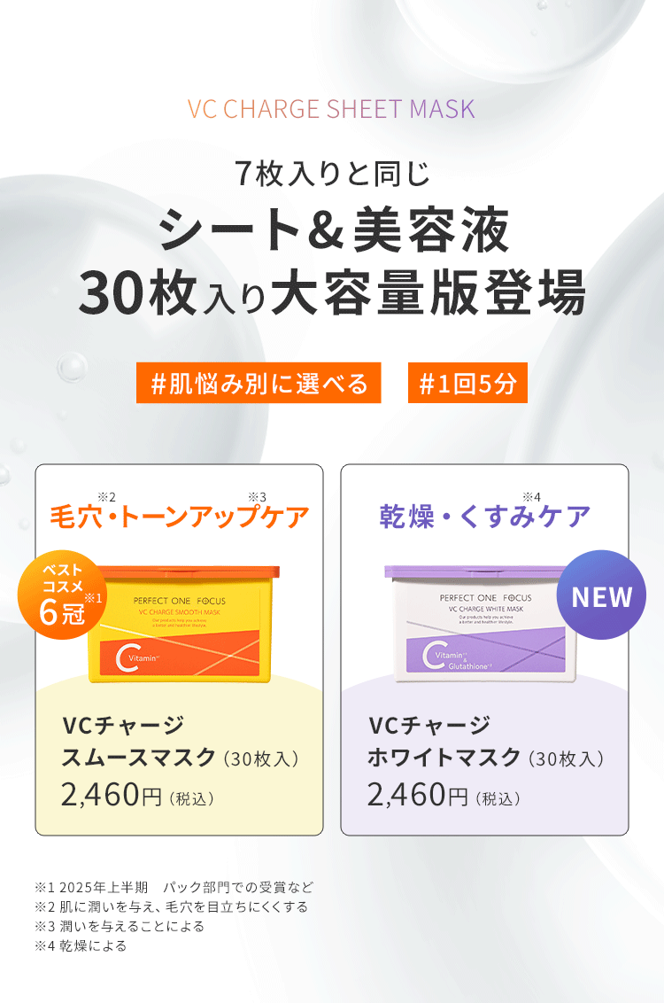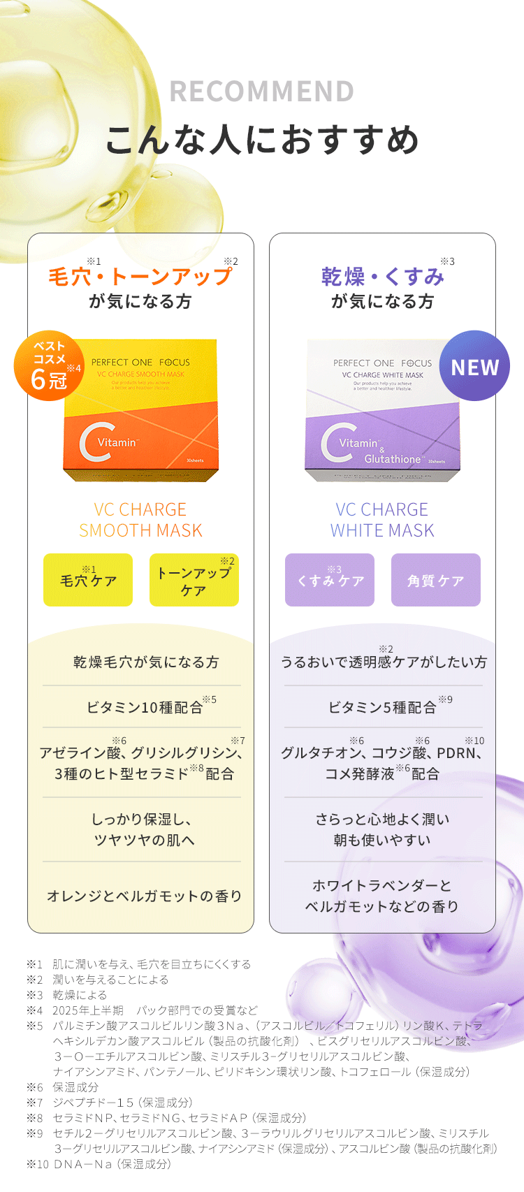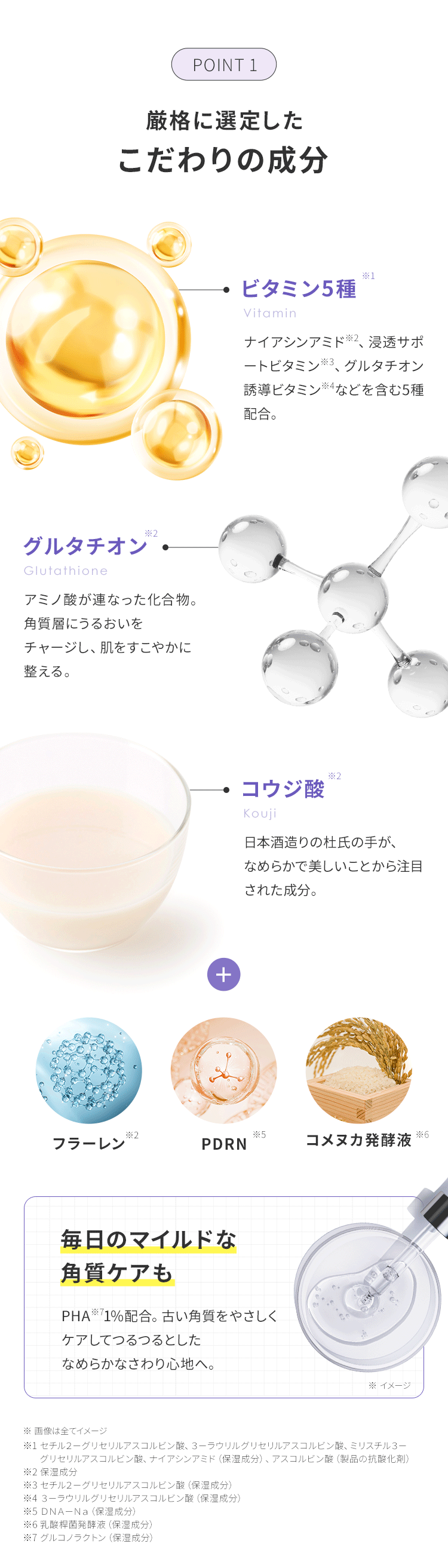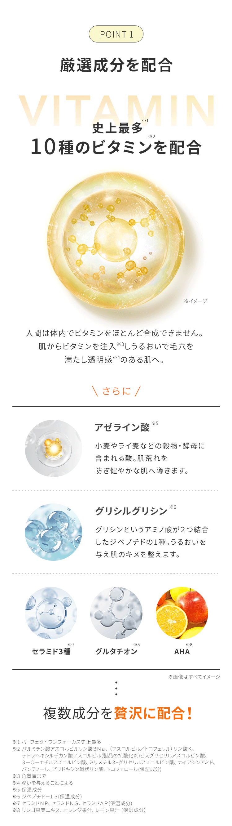 APPS※3やナイアシンアミド※4など、 こだわって厳選したパーフェクトワンフォーカス最多の10種のビタミン※1を配合。たっぷりの潤いをチャージして毛穴※2・透明感※5ケアの両方を叶え、ツヤツヤの輝く肌へ導きます。