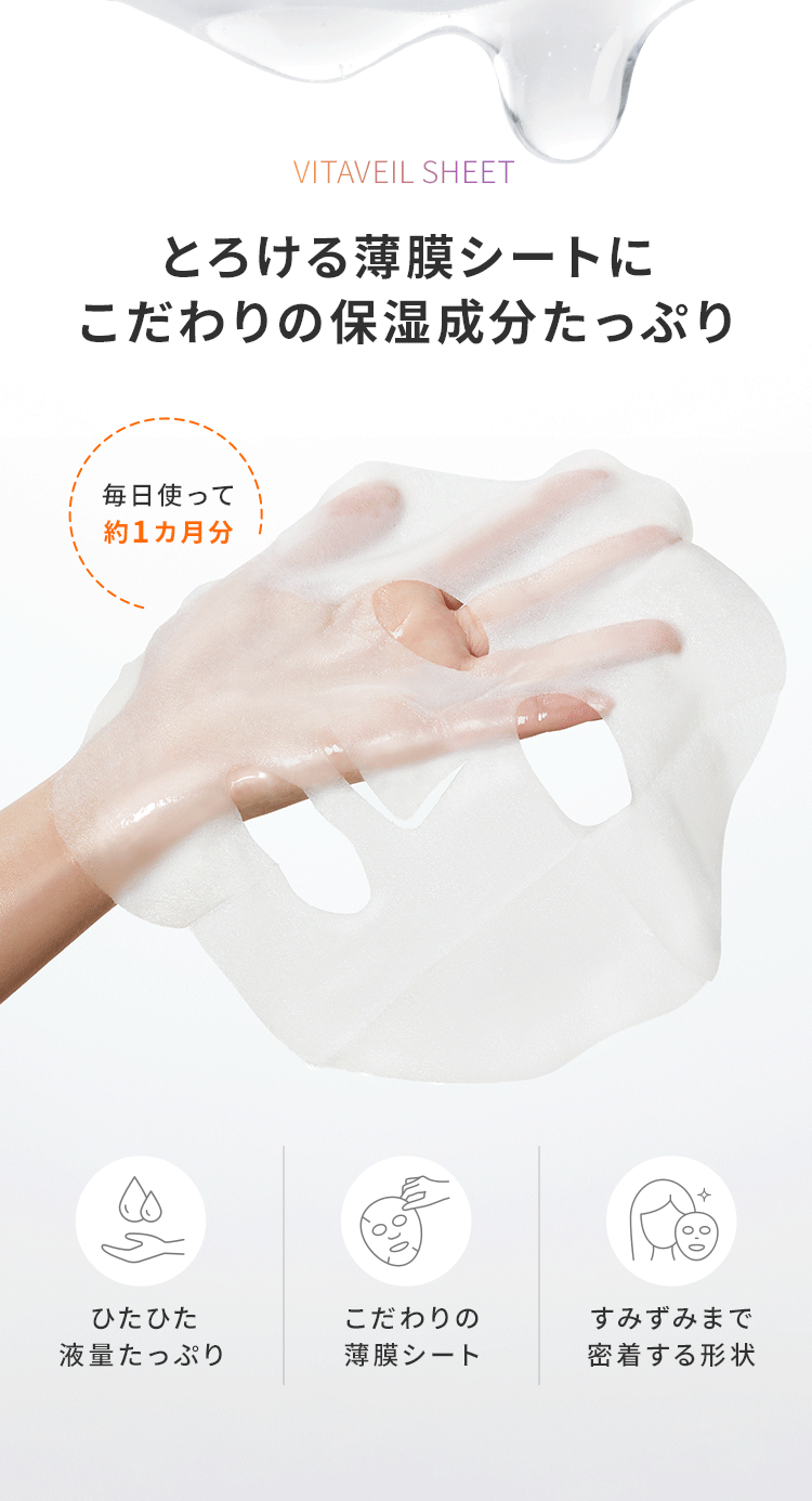 30枚入りで400mlの美容液をたっぷり含み、ひたひたのうるおいでシート全体が満ちています。薄膜なのにとろけるような肌触りで、まるで肌になりすまし一体化するような密着感が特長です。