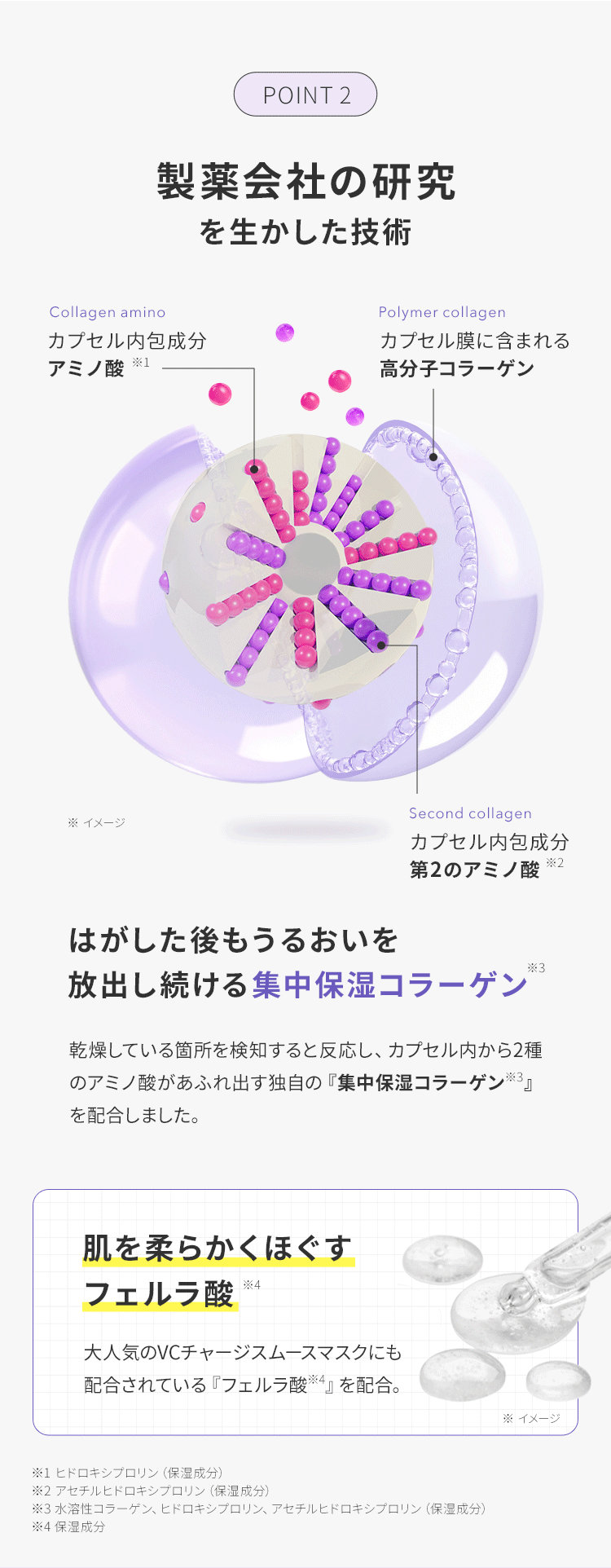 ※1 パルミチン酸アスコルビルリン酸3Na、(アスコルビル/トコフェリル)リン酸K、テトラヘキシルデカン酸アスコルビル(製品の抗酸化剤)、ビスグリセリルアスコルビン酸、3-O-エチルアスコルビン酸、ミリスチル3−グリセリルアスコルビン酸、ナイアシンアミド、パンテノール、ピリドキシン環状リン酸、トコフェロール(保湿成分) ※2 肌に潤いを与え、毛穴を目立ちにくくする ※3 パルミチン酸アスコルビルリン酸3Na(製品の抗酸化剤) ※4 保湿成分 ※5 潤いを与えることによる
