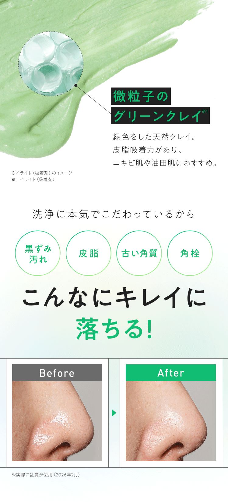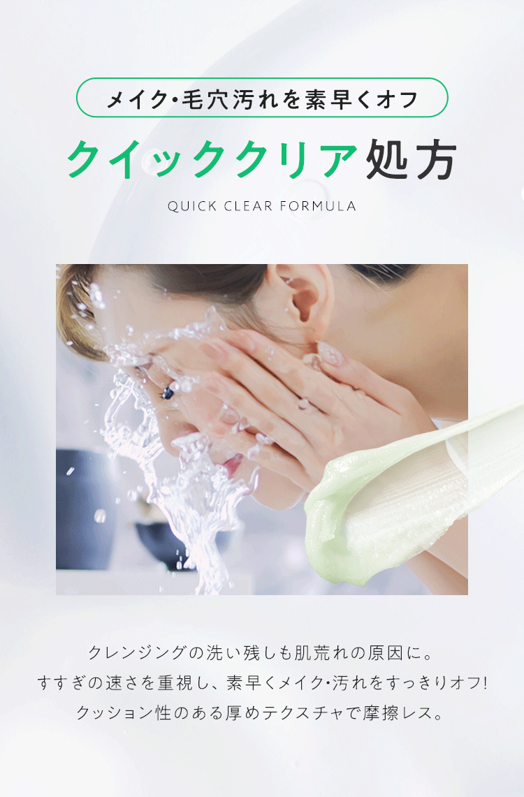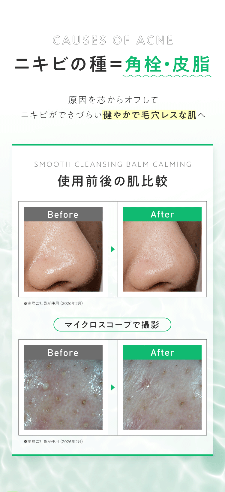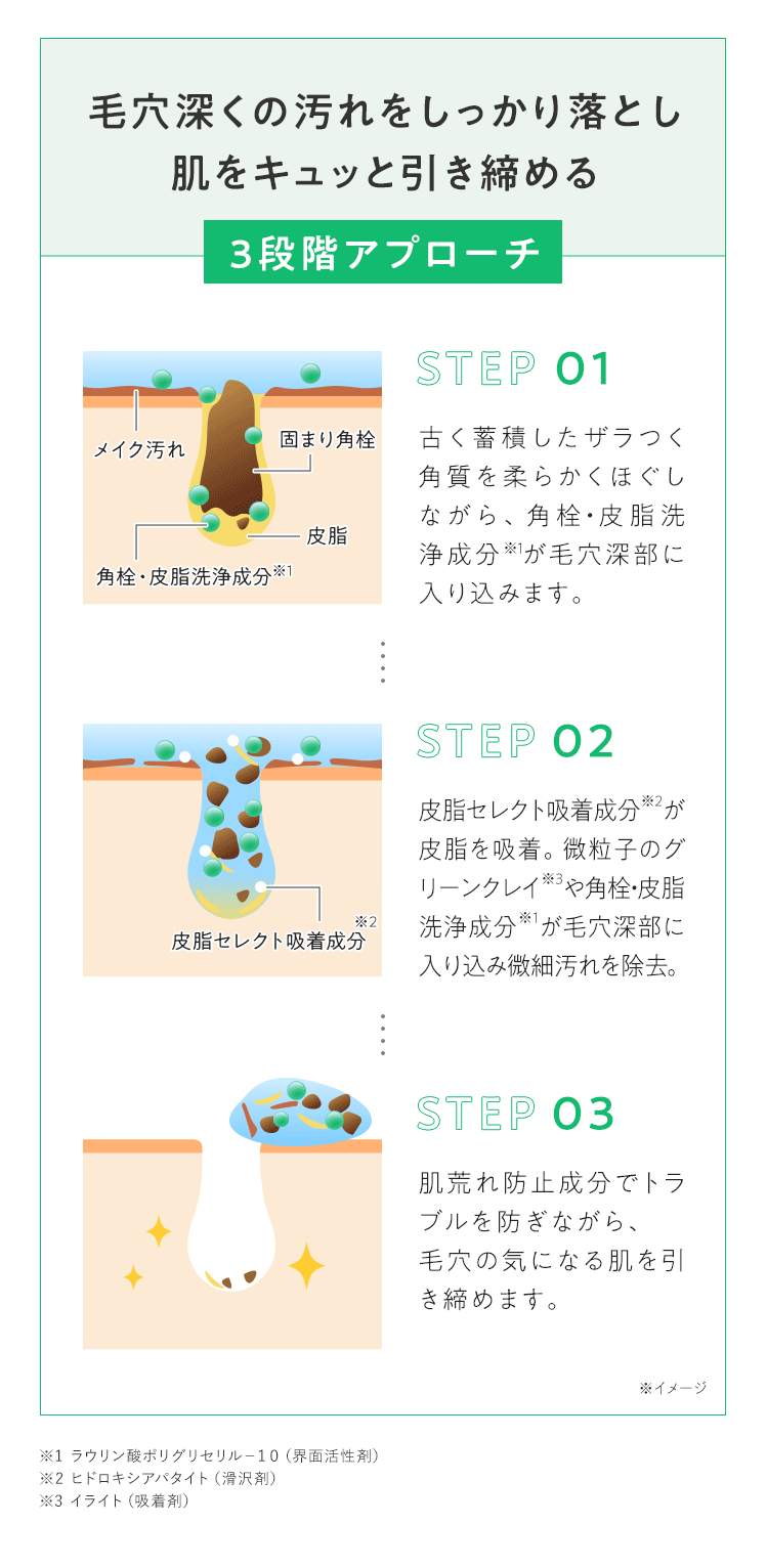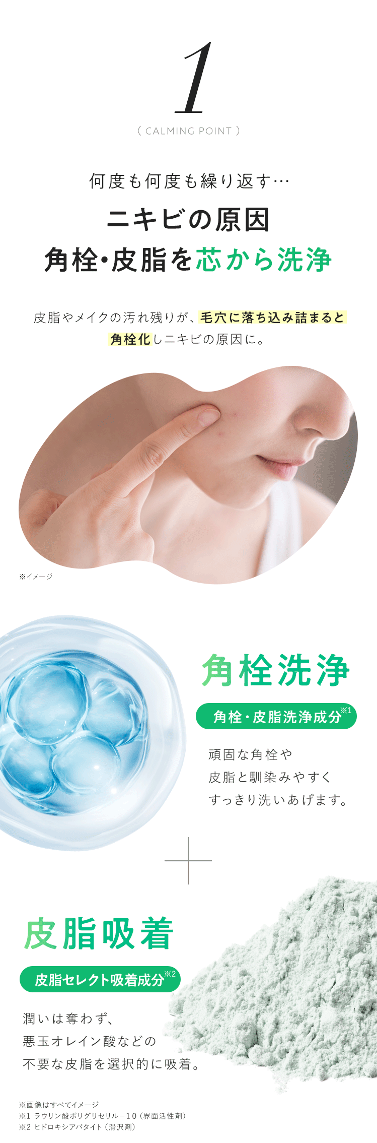 皮脂が毛穴に落ち込み詰まると角栓化し、ニキビの原因に。まずはニキビの種となる皮脂・角栓をオフして 『ニキビができづらい健やかで毛穴レスな肌』に整えます。
