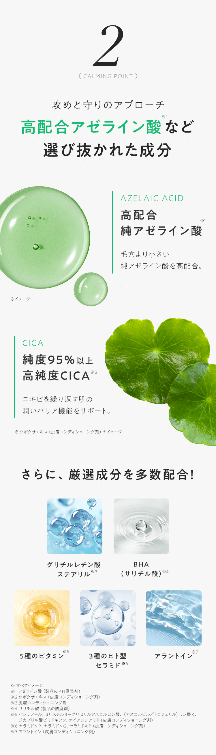 「高配合アゼライン酸※1」×「高濃度CICA※2など14種の肌荒れ防止成分※3」配合。