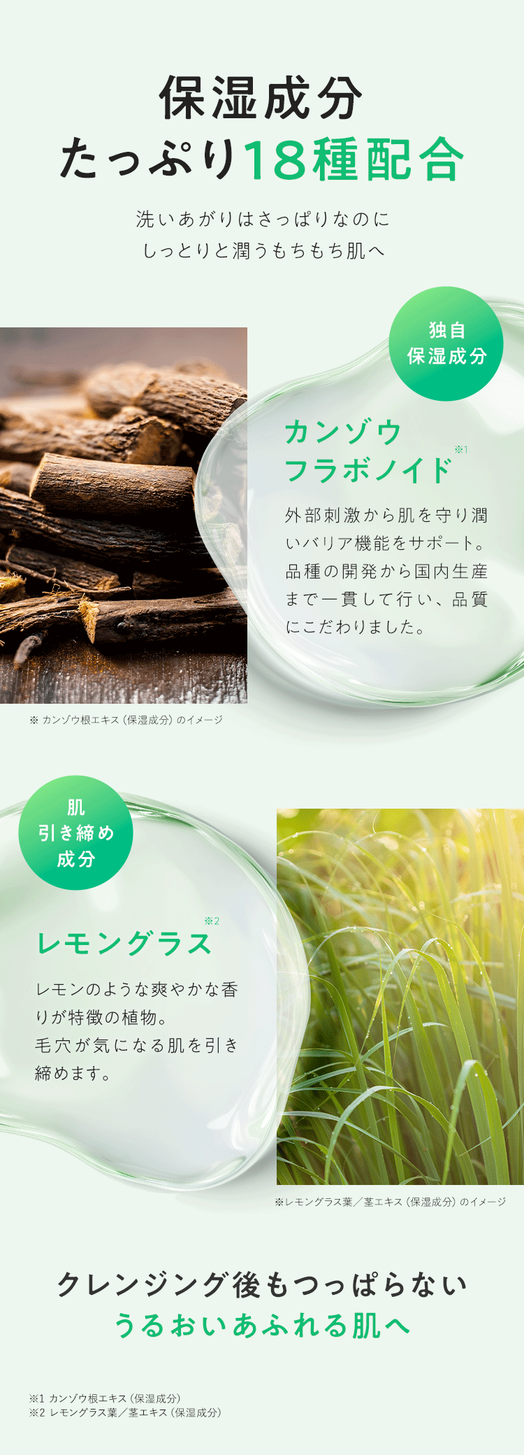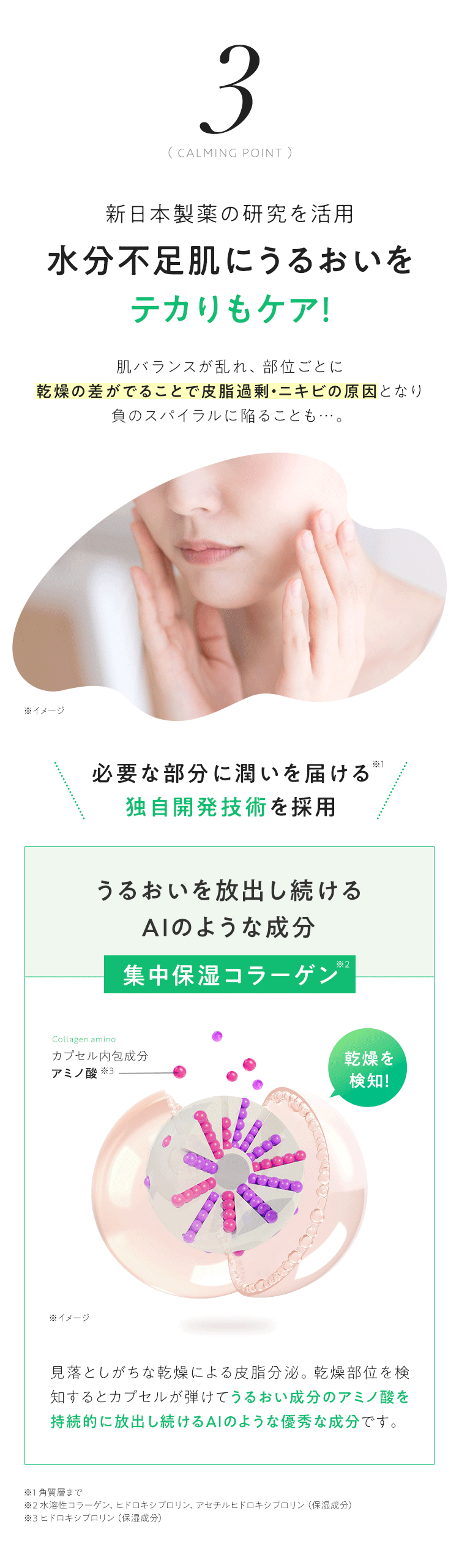 ※1 製品のPH調整剤 ※2 ツボクサエキス(皮膚コンディショニング剤) ※3 グリチルレチン酸ステアリル、パンテノール、ミリスチル3−グリセリルアスコルビン酸、(アスコルビル/トコフェリル)リン酸K、ジカプリル酸ピリドキシン、ナイアシンアミド、ドクダミエキス、ツボクサエキス、ポリリシン、ヤナギラン花/葉/茎エキス(皮膚コンディショニング剤)、レモングラス葉/茎エキス、サピンヅストリホリアツス果実エキス、加水分解コラーゲン、カンゾウ根エキス(保湿成分)