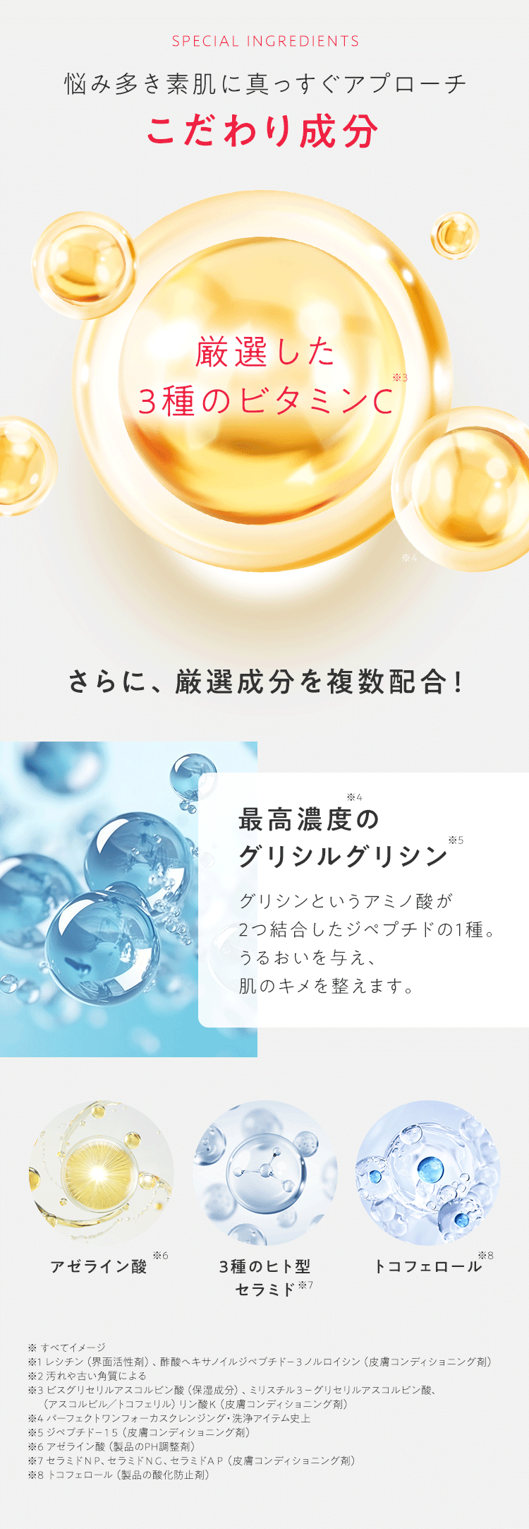 ※1 汚れや古い角質による ※2 汚れや古い角質を落とすことによる ※3 ヒドロキシアパタイト(滑沢剤)が悪玉化したオレイン酸を吸着する技術 ※4 保湿成分