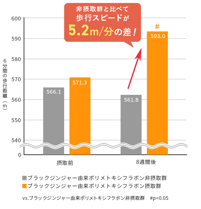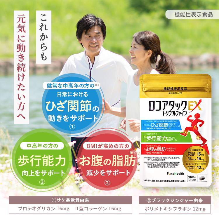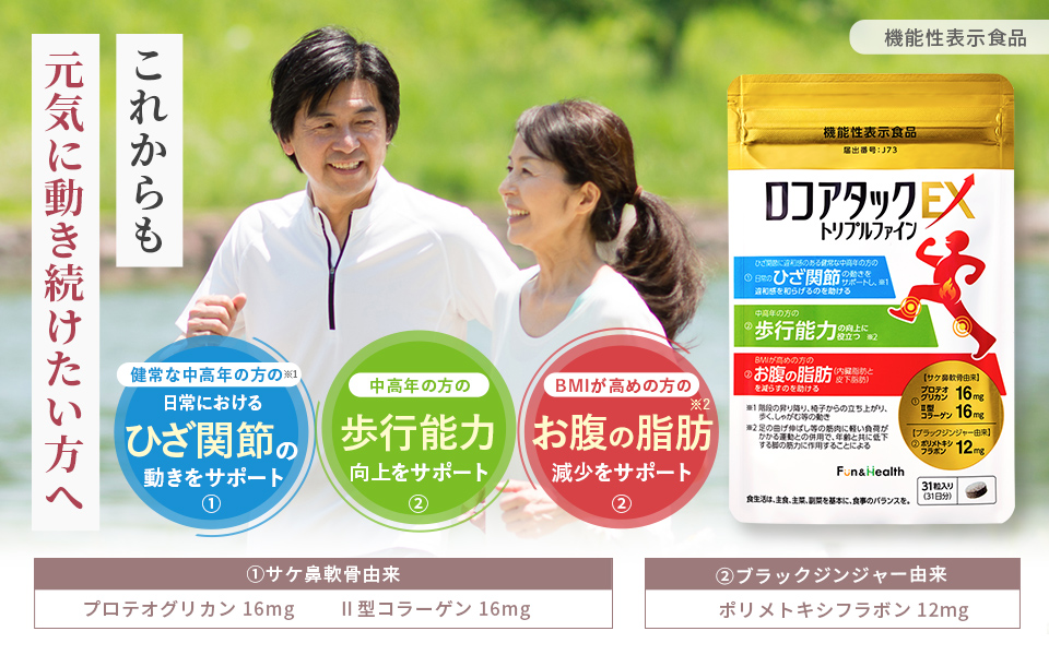 ブラックジンジャー由来ポリメトキシフラボンは、足の曲げ伸ばし等の筋肉に軽い負荷がかかる運動との併用で、年齢とともに低下する脚の筋力に作用し、中高年の方の歩行能力の向上に役立つ機能が報告されています。