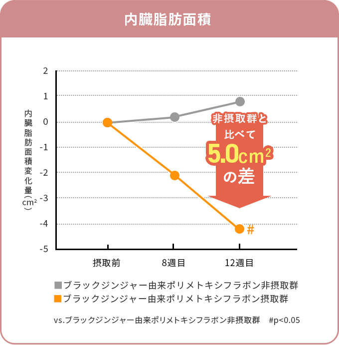 ブラックジンジャー由来ポリメトキシフラボンは、日常活動時のエネルギー代謝において脂肪を消費しやすくする作用により、肥満気味の方(BMIが高めの方)の腹部の脂肪(内臓脂肪と皮下脂肪)を減らす機能が報告されています。