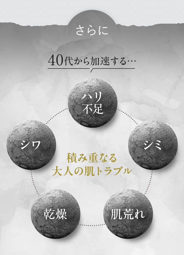 さらに40代から加速する…シワ ハリ不足 シミ 乾燥 肌荒れ 積み重なる大人の肌トラブル