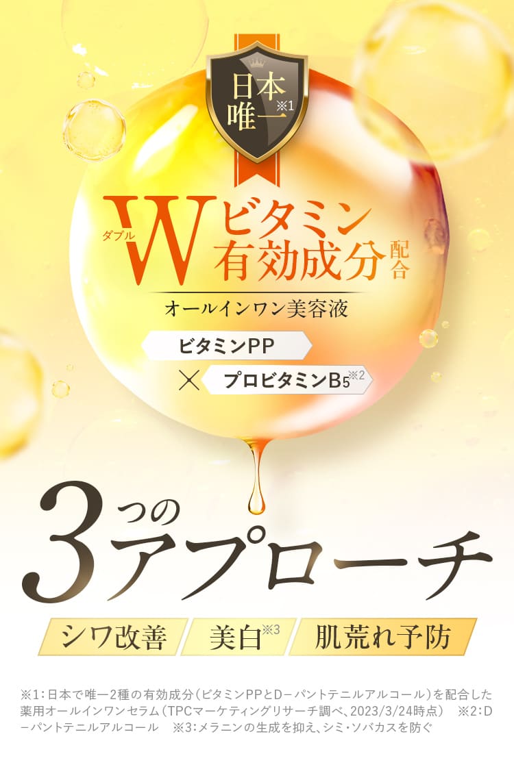 日本 唯一Wビタミン有効成分配合オールインワン美容液 ビタミンPP×プロビタミンB5 3つのアプローチ シワ改善 美白 肌荒れ予防
