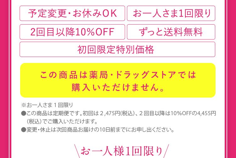 ※ お一人さま1回限り ● この商品は定期便です、初回は2,475円(税込)、2回目以降は10%OFFの4,455円(税込)でご購入いただけます。 ● 変更・休止は次回商品お届け日の10日前までにお申し出ください。 お得に購入する 定期購入について
