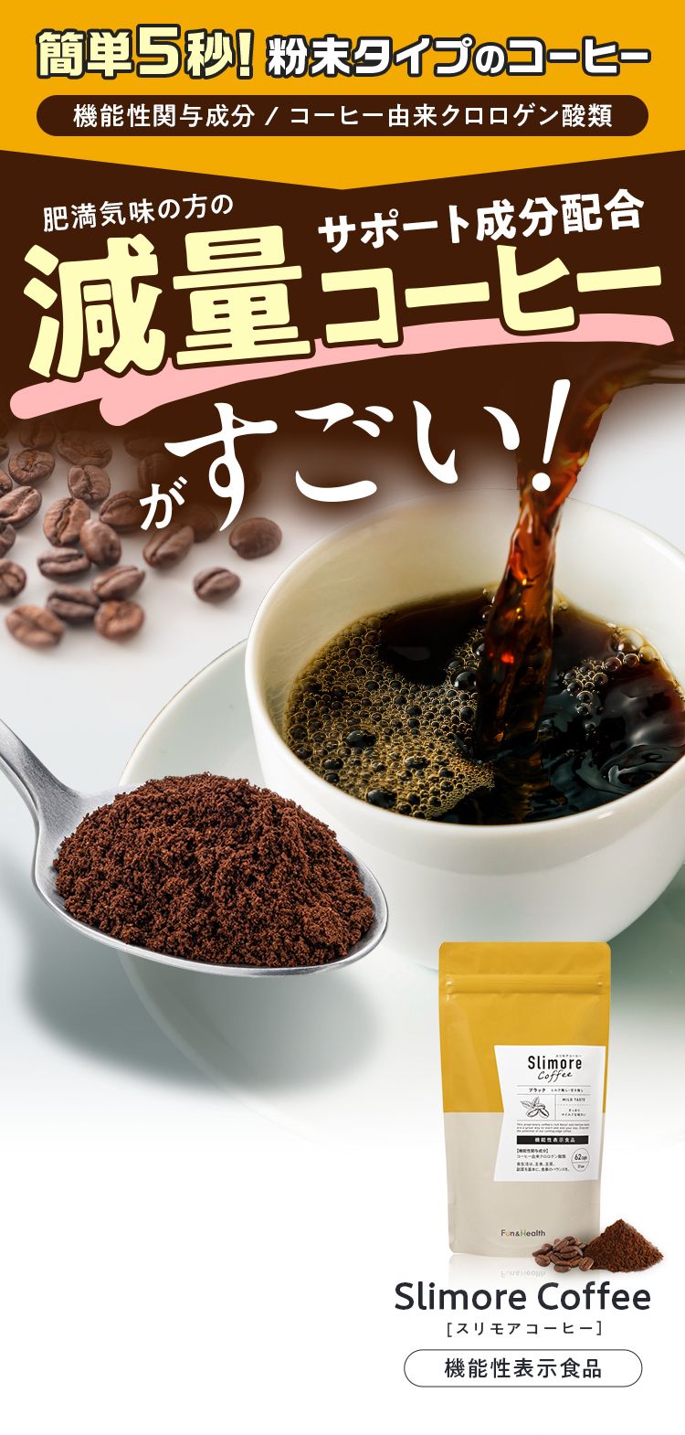 機能性関与成分 コーヒー由来 クロロゲン酸類とは?コーヒー由来 クロロゲン酸類はコーヒー生豆に含まれるポリフェノールの一種。スリモアコーヒーは一般的な インスタントコーヒーに比べ 2~4倍以上のクロロゲン酸を含有!