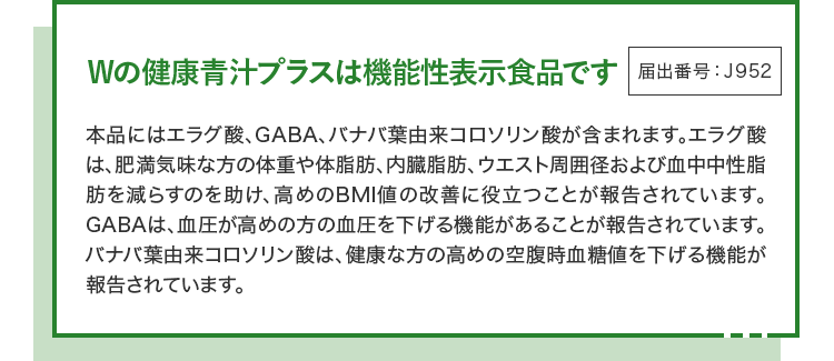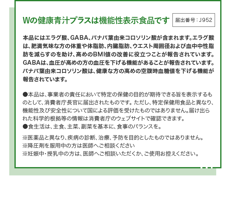 エラグ酸とGABAをW配合! 「Wの健康青汁」で肥満気味の方の血中中性脂肪 肥満気味の方の体脂肪・内臓脂肪 高めの血圧 肥満気味の方の体重 肥満気味の方のウエスト周囲径