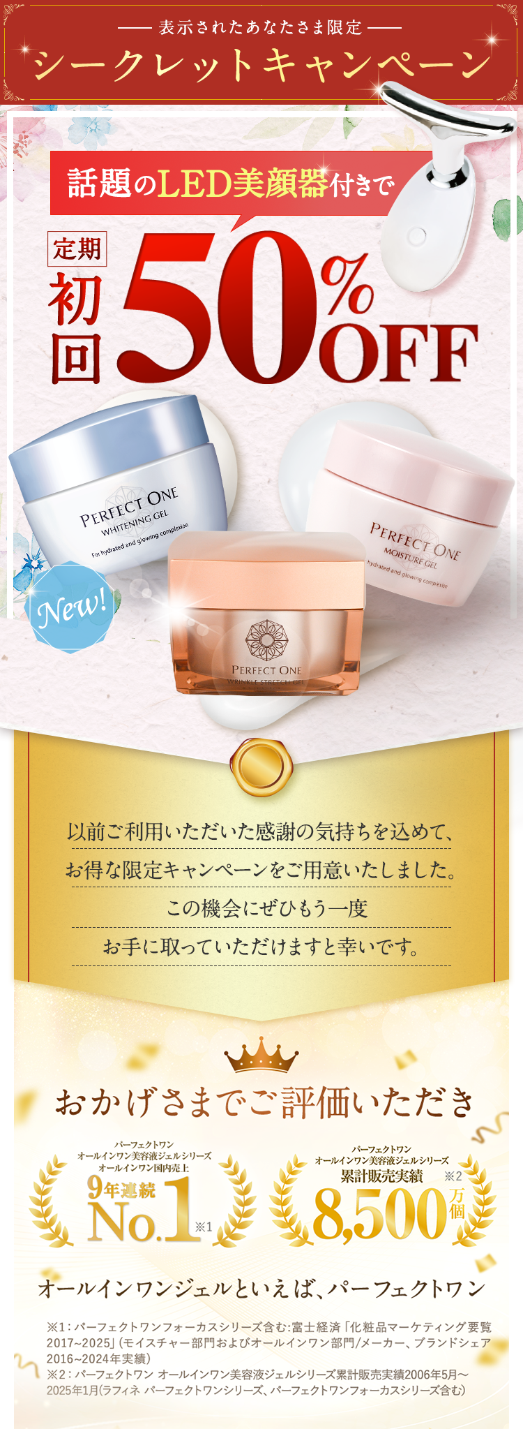 定期購入の中止は4回目以降より承っております(「医薬品」及び「パーフェクトワン フォーカスシリーズ」を除く)。(肌トラブル等の場合などやむを得ない場合、ご相談ください。)3回継続後、お客さまより当社に中止のお申し出がない場合、本契約は自動更新するものとし、以後も同様とします。
