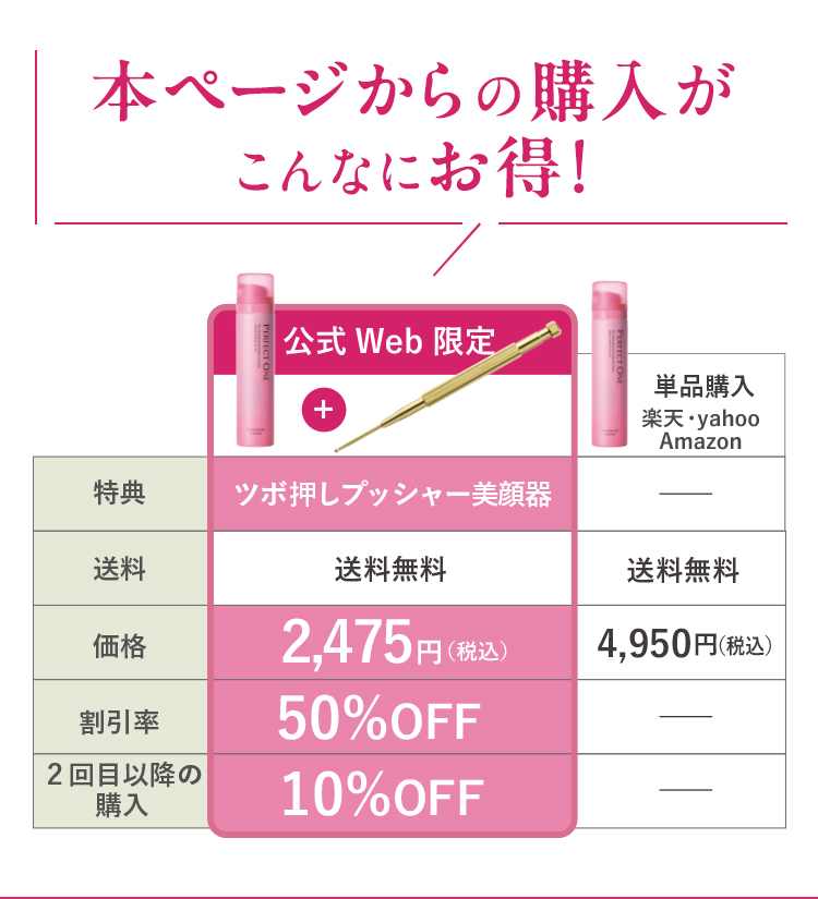 - 定期購入の中止は4回目以降より承っております(「医薬品」及び「パーフェクトワン フォーカスシリーズ」を除く)。(肌トラブル等の場合などやむを得ない場合、ご相談ください。)3回継続後、お客さまより当社に中止のお申し出がない場合、本契約は自動更新するものとし、以後も同様とします。
