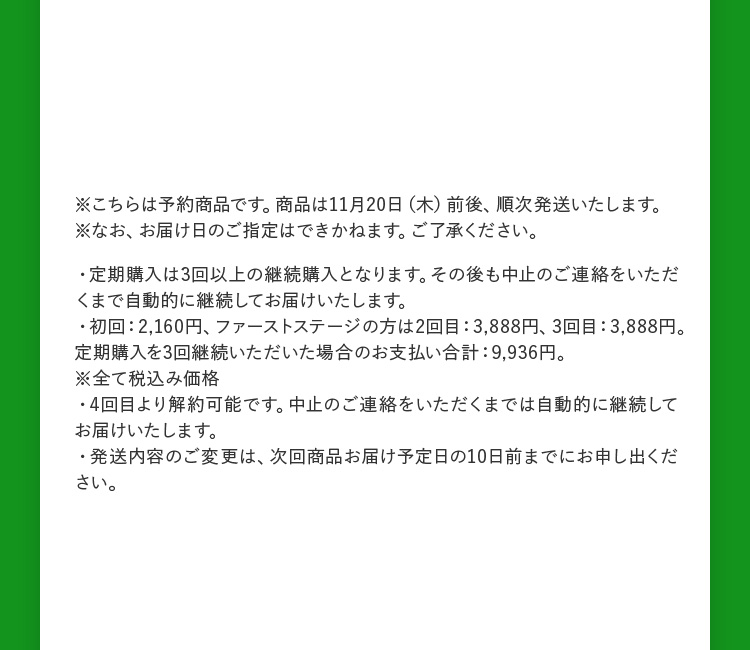 - 定期購入は3回以上の継続購入※が必要となり、4回目以降は自動更新となります。定期購入のお届けサイクルは「毎月」か「2ヵ月ごと(隔月)」となっております。「2ヵ月ごと(隔月)」をご希望の方はお問い合わせフォームよりご連絡ください。お休みは、お届けサイクルが「毎月」の方は2回まで、お届けサイクルが「2ヵ月ごと(隔月)」の方は1回までとさせていただきます。お届けサイクルの変更や商品変更・ご購入の停止は次回商品お届け予定日の10日前までにお申し出ください。