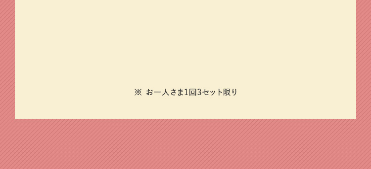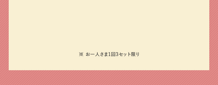 - 定期購入は3回以上の継続購入※が必要となり、4回目以降は自動更新となります。定期購入のお届けサイクルは「毎月」か「2ヵ月ごと(隔月)」となっております。「2ヵ月ごと(隔月)」をご希望の方はお問い合わせフォームよりご連絡ください。お休みは、お届けサイクルが「毎月」の方は2回まで、お届けサイクルが「2ヵ月ごと(隔月)」の方は1回までとさせていただきます。お届けサイクルの変更や商品変更・ご購入の停止は次回商品お届け予定日の10日前までにお申し出ください。