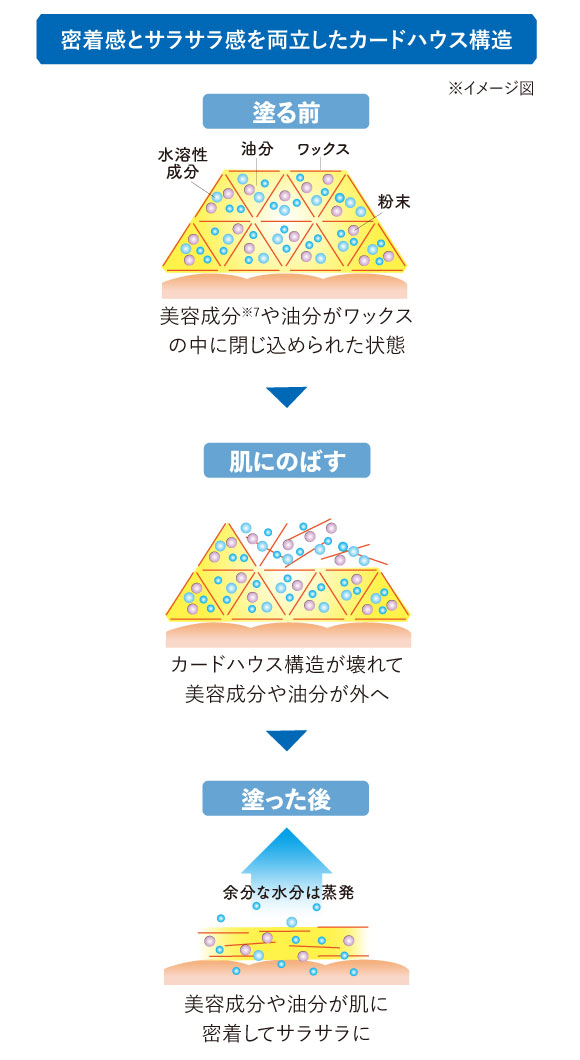最大の特徴でもある「バーム形状」は、肌を薄く包み込むように密着するため、乾燥やほこりなどの外部刺激から守ってくれます。それを可能にしたのが美容成分※7を閉じ込めた「カードハウス構造」。肌にのばした瞬間にとろけ、美容成分※7のべールをつくります。