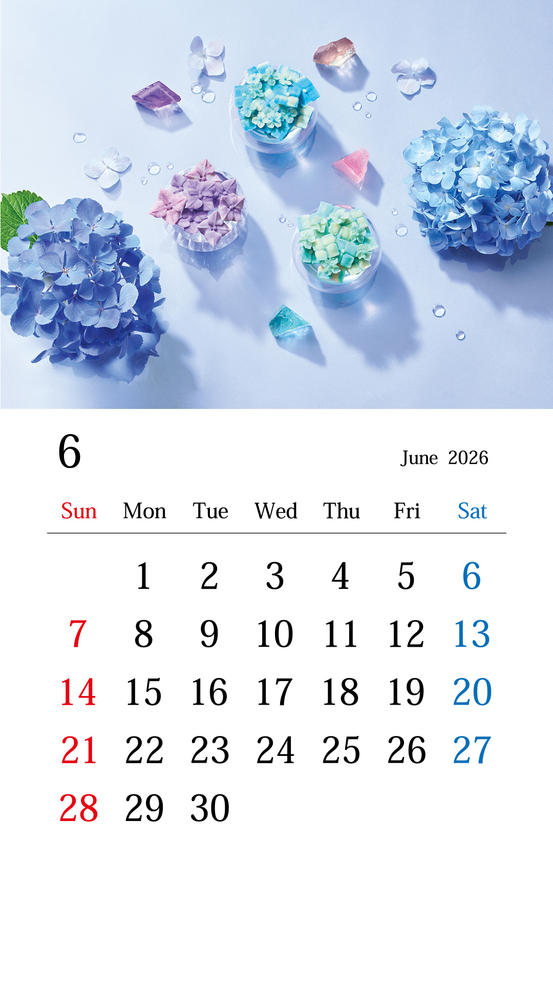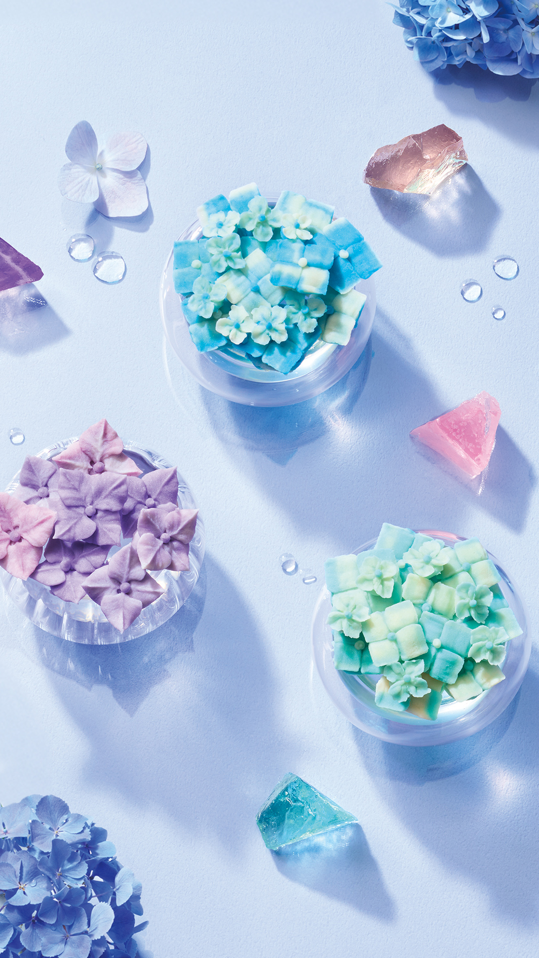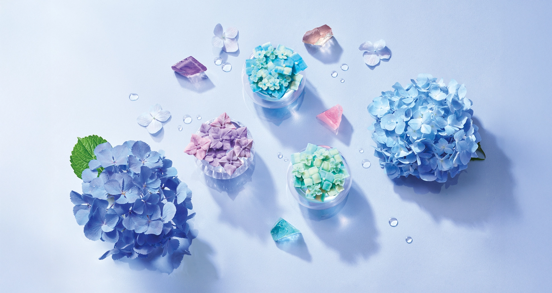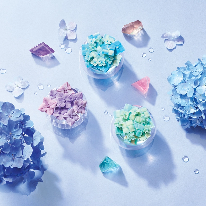 雨上がりのみずみずしいアジサイと爽快な日差しを、あんフラワーと輝く琥珀糖で表現。梅雨の季節も心軽やかに過ごしましょう。