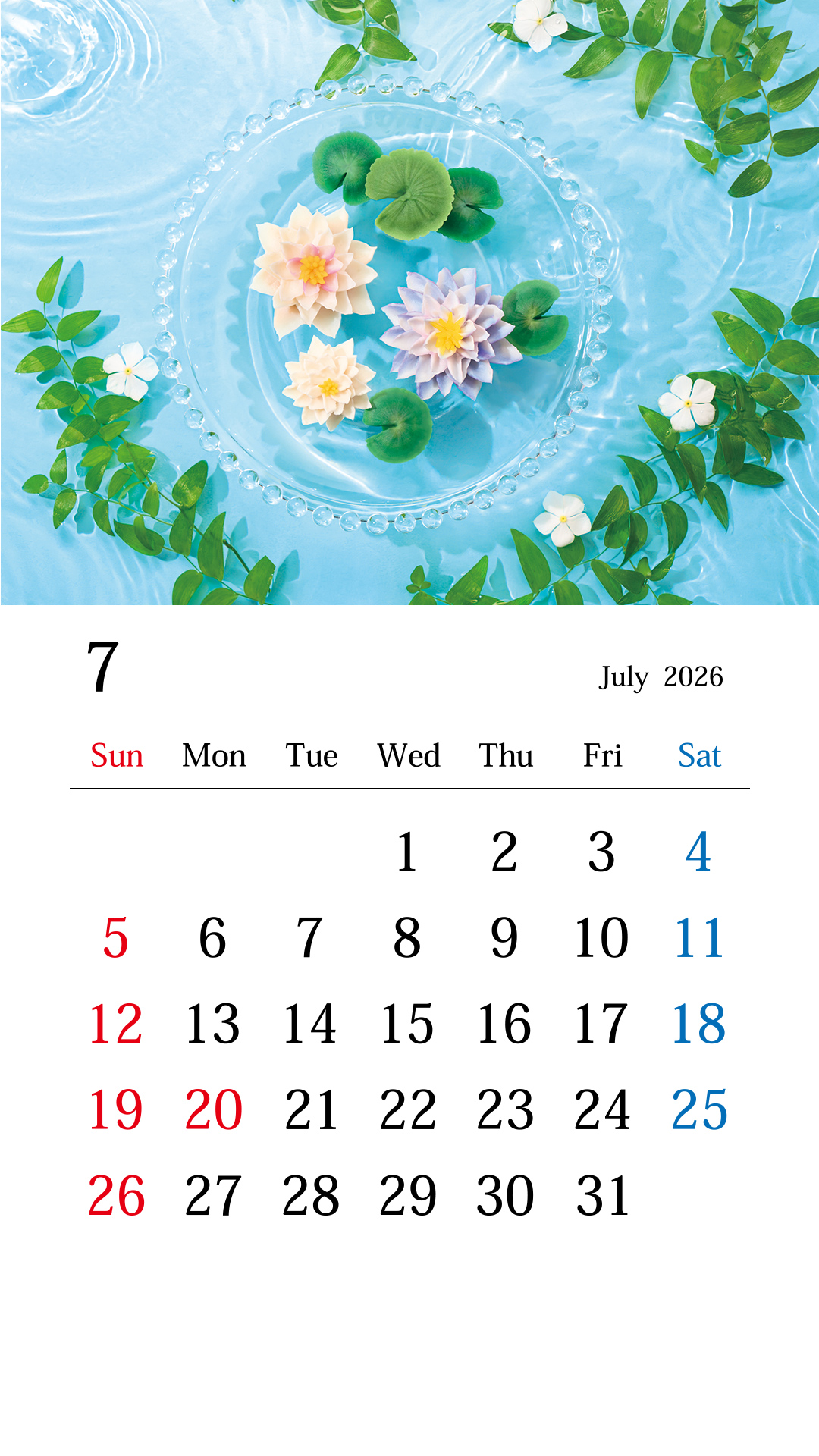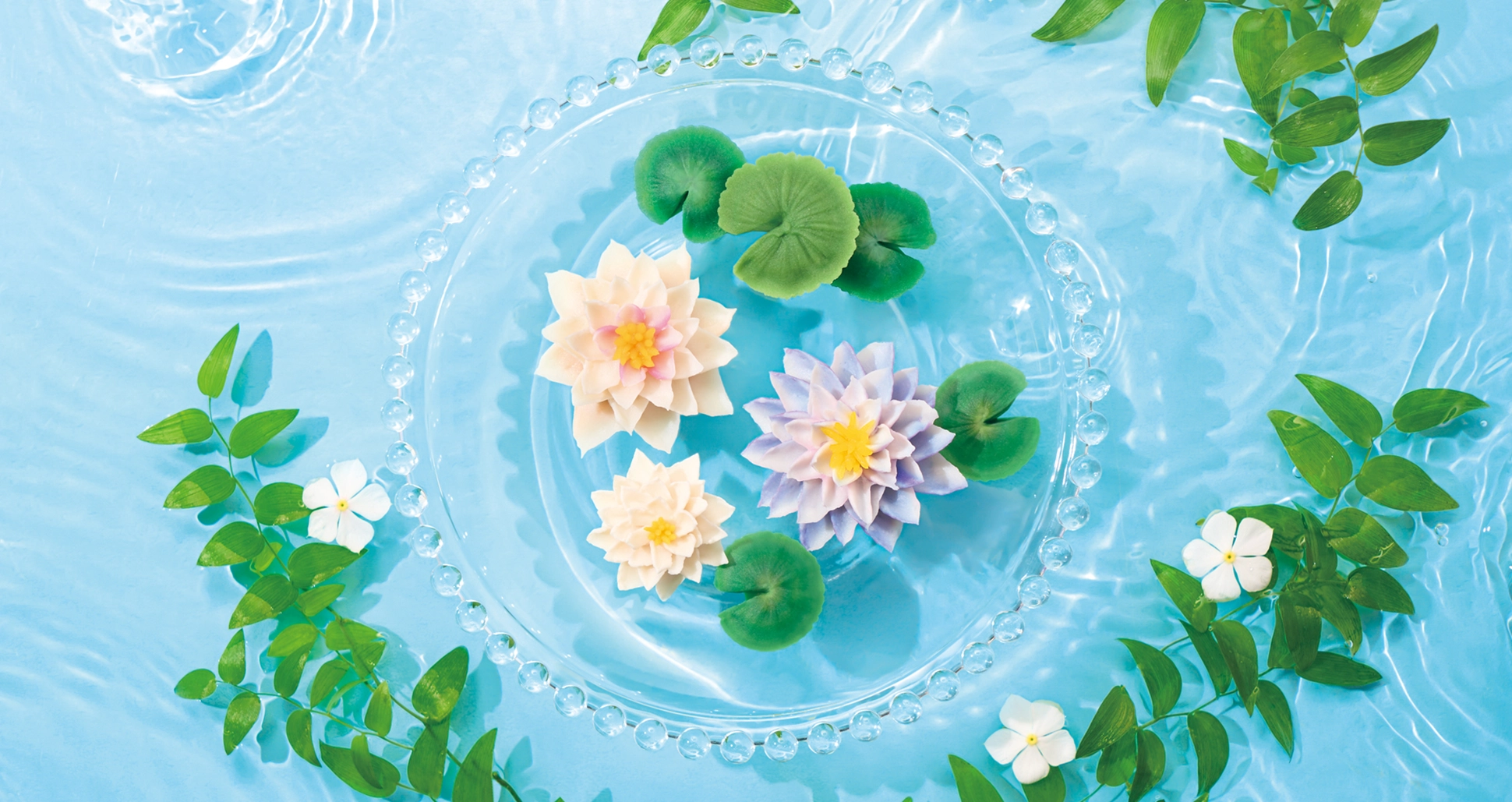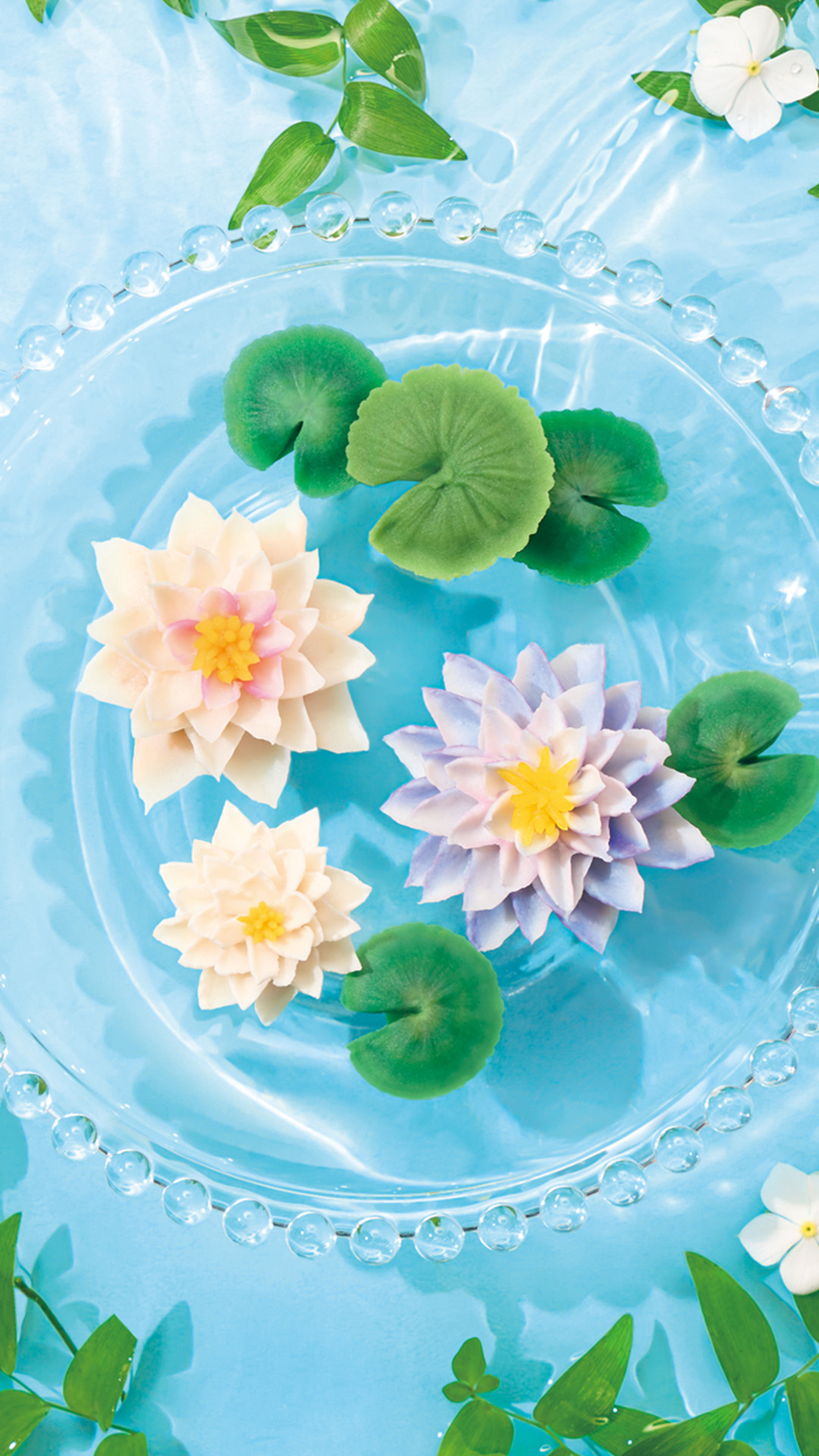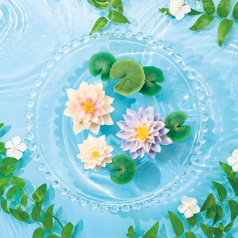 水辺に浮かぶモネのスイレンをイメージしたあんフラワーと、涼風に揺れる水草の輝きで涼をお届けします。暑さに負けず元気いっぱいの7月を迎えましょう。