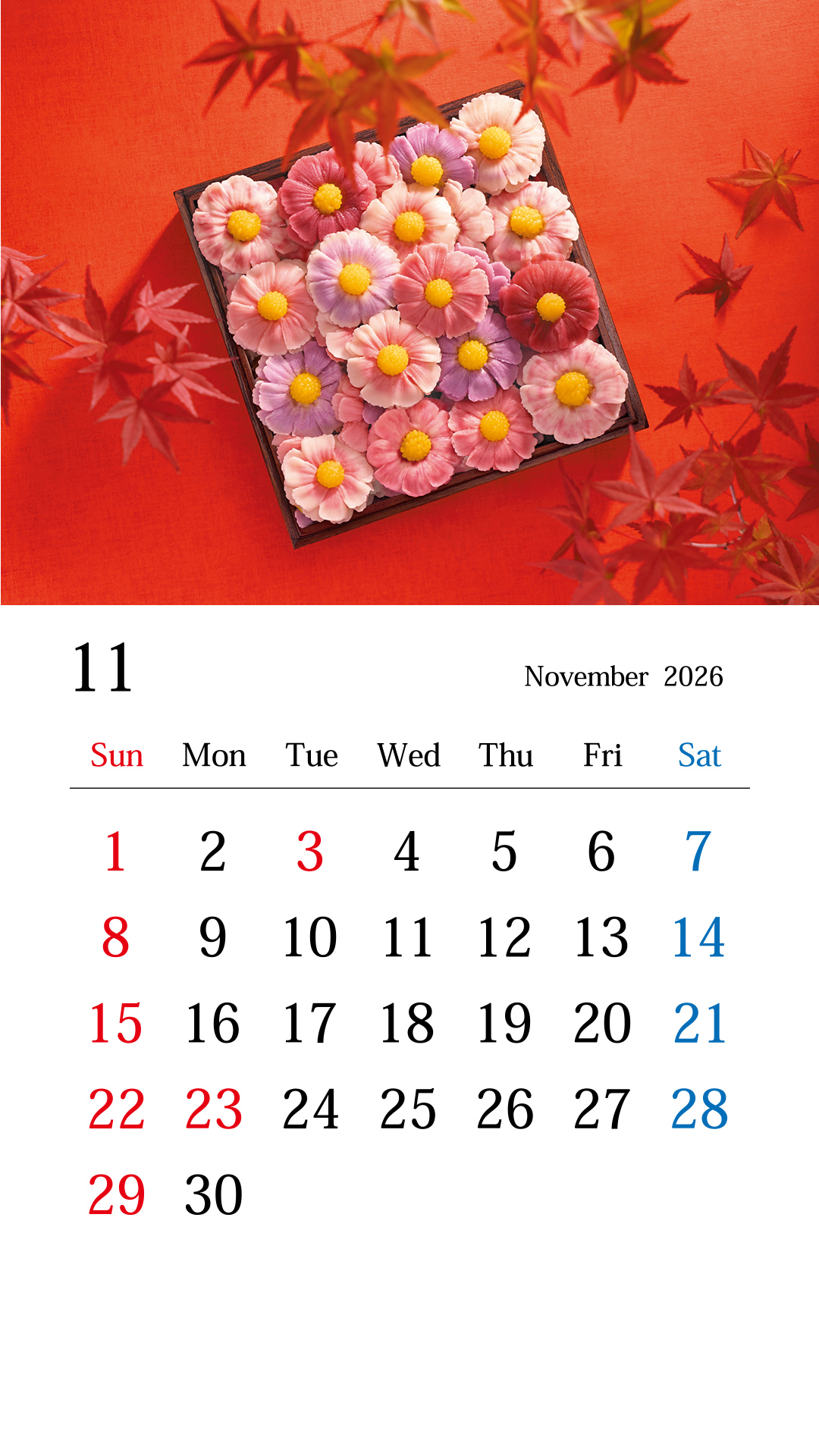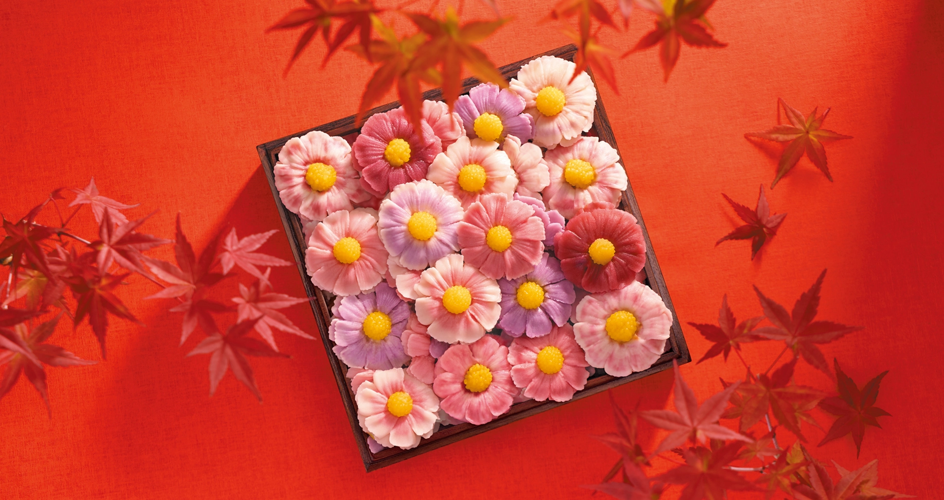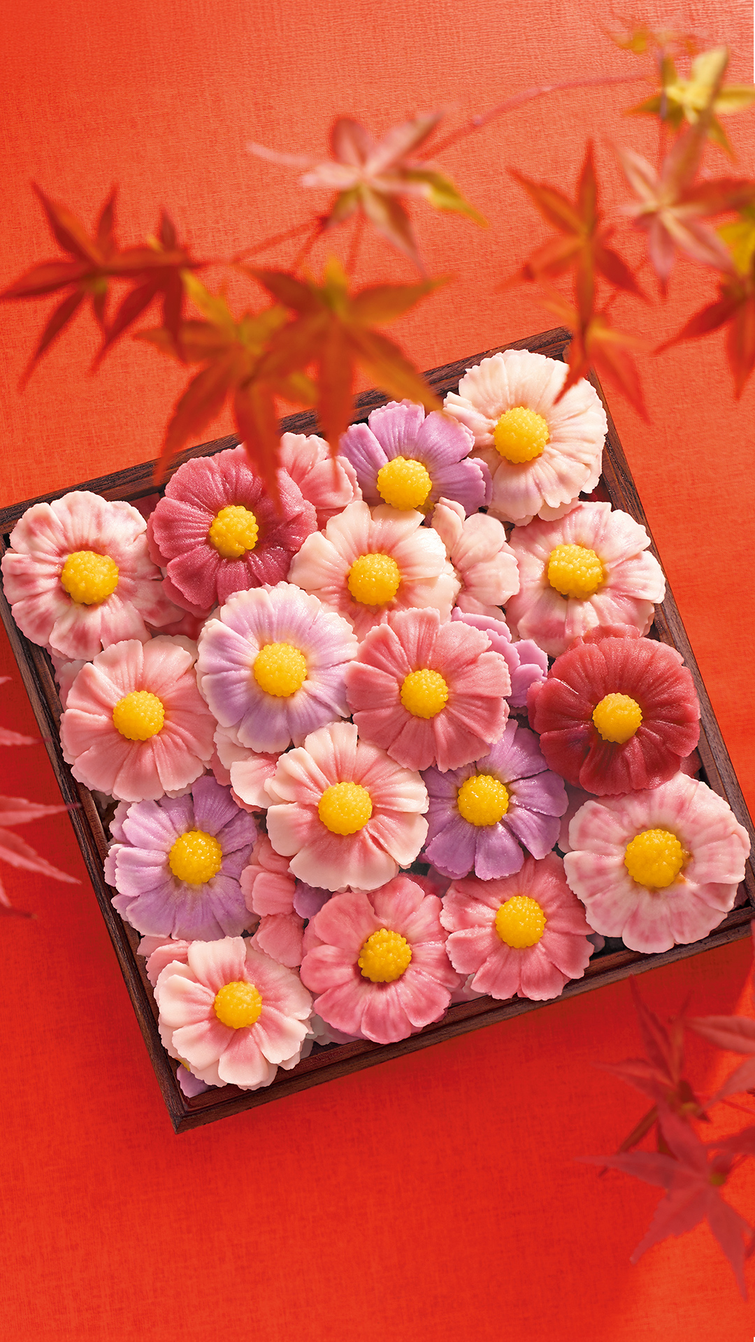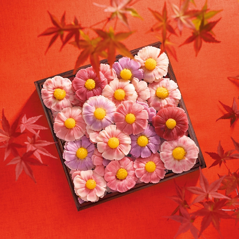 秋桜(あきざくら)の名でも親しまれるコスモスをあんフラワーにして華やかな秋のお重に。彩り豊かなこの季節、アクティブに外出を楽しみませんか。