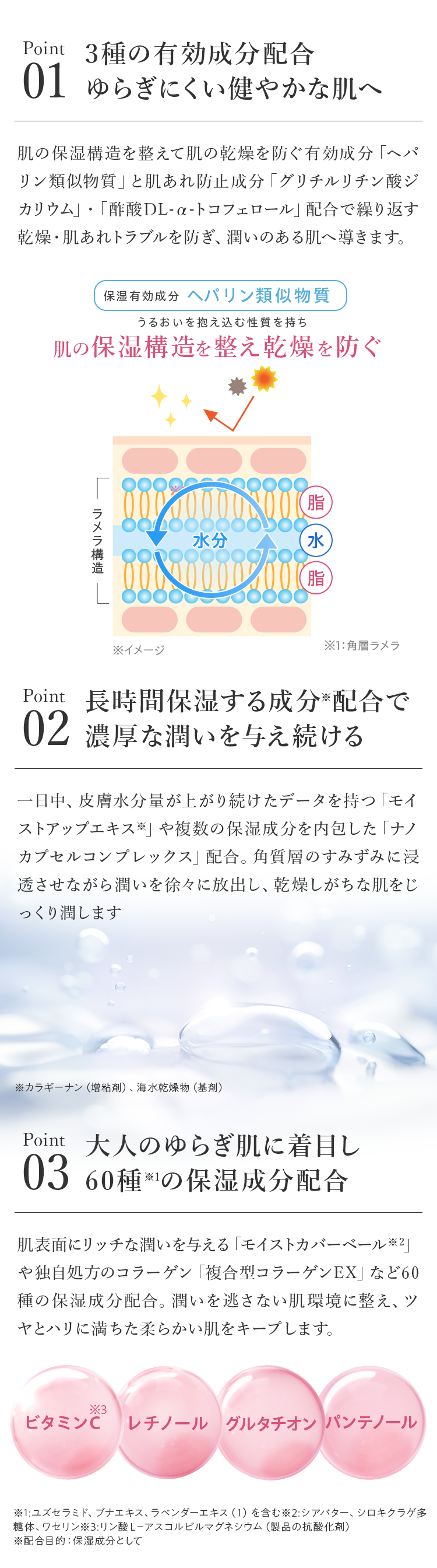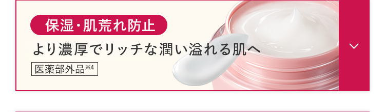 ※1:シワを改善する。メラニンの生成を抑え、シミ・ソバカスを防ぐ ※2:メラニンの生成を抑え、シミ・ソバカスを防ぐ ※3:メラニンの生成を抑え、シミ・ソバカスを防ぐ。肌に潤いを与える ※4:肌の乾燥・肌あれを防ぐ