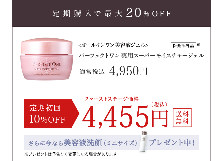 - 定期購入の中止は4回目以降より承っております(「医薬品」及び「パーフェクトワン フォーカスシリーズ」を除く)。(肌トラブル等の場合などやむを得ない場合、ご相談ください。)3回継続後、お客さまより当社に中止のお申し出がない場合、本契約は自動更新するものとし、以後も同様とします。