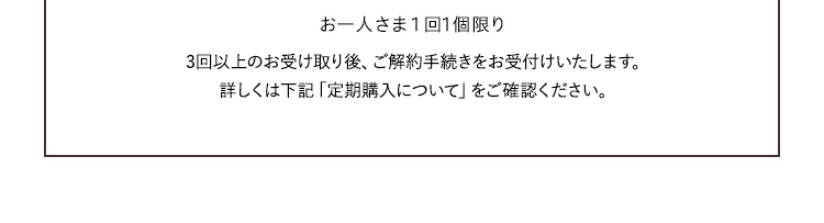 - ・定期購入は3回以上の継続購入となります。その後も中止のご連絡をいただくまで自動的に継続してお届けいたします。