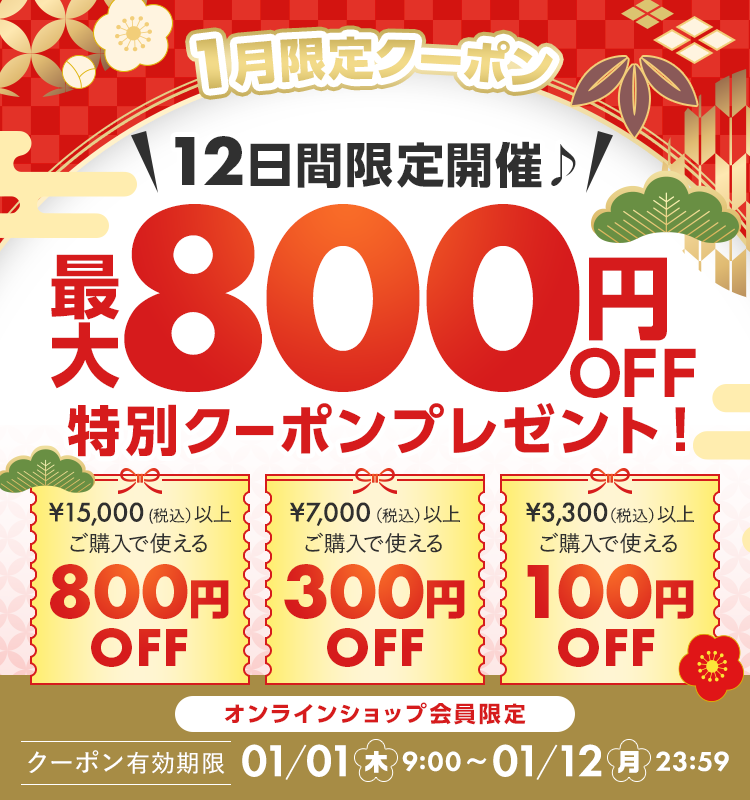 『12日間限定!新春クーポンイベント』開催! 3,300円(税込)から使えるスペシャルクーポンを配布いたします。 クーポンを使って気になっていた商品をぜひお得にゲットしてください♪
